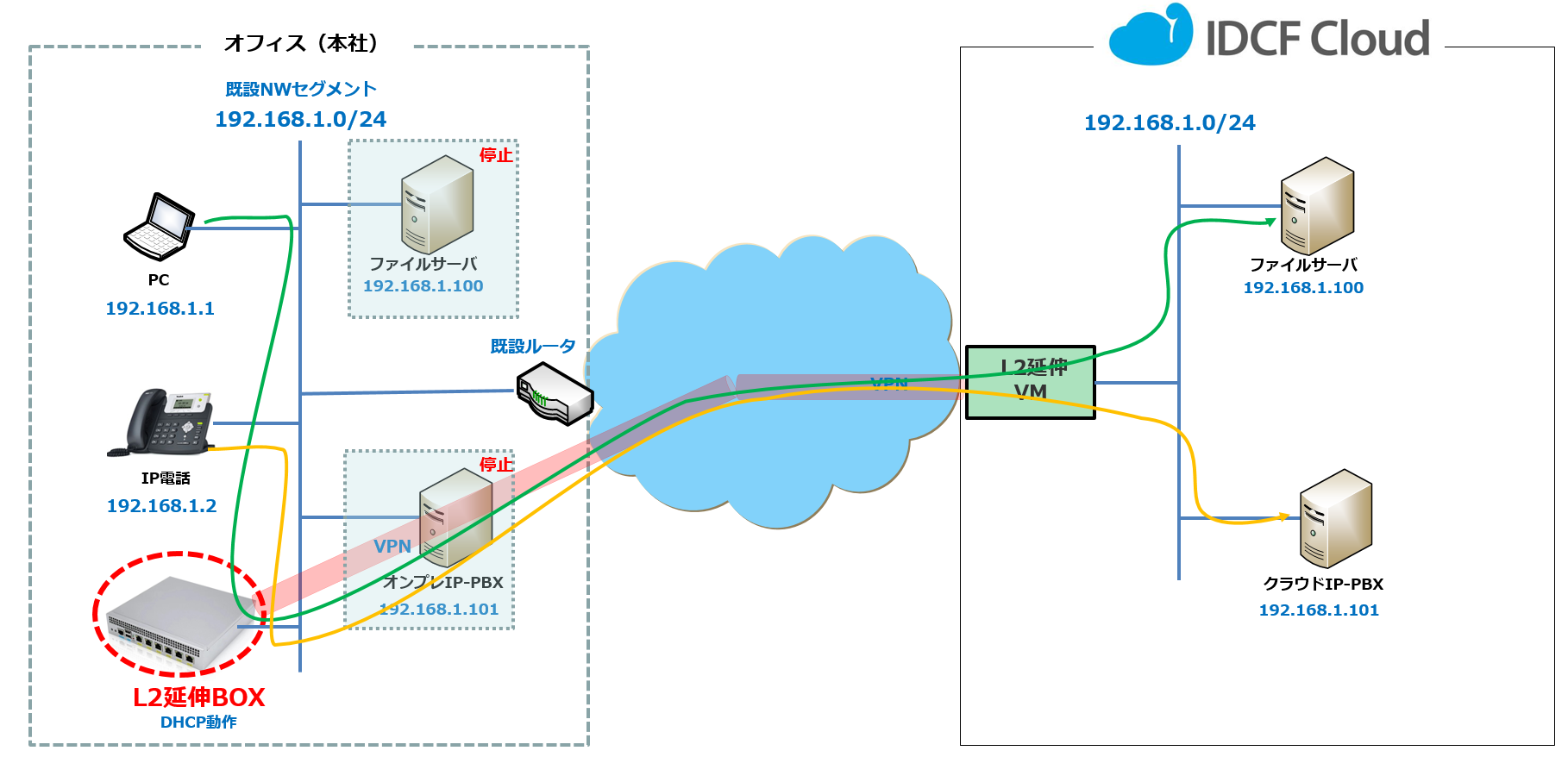 L2延伸BOXをLANへつなぐだけで、クラウド側のファイルサーバ、IP-PBXが使えるようになります。