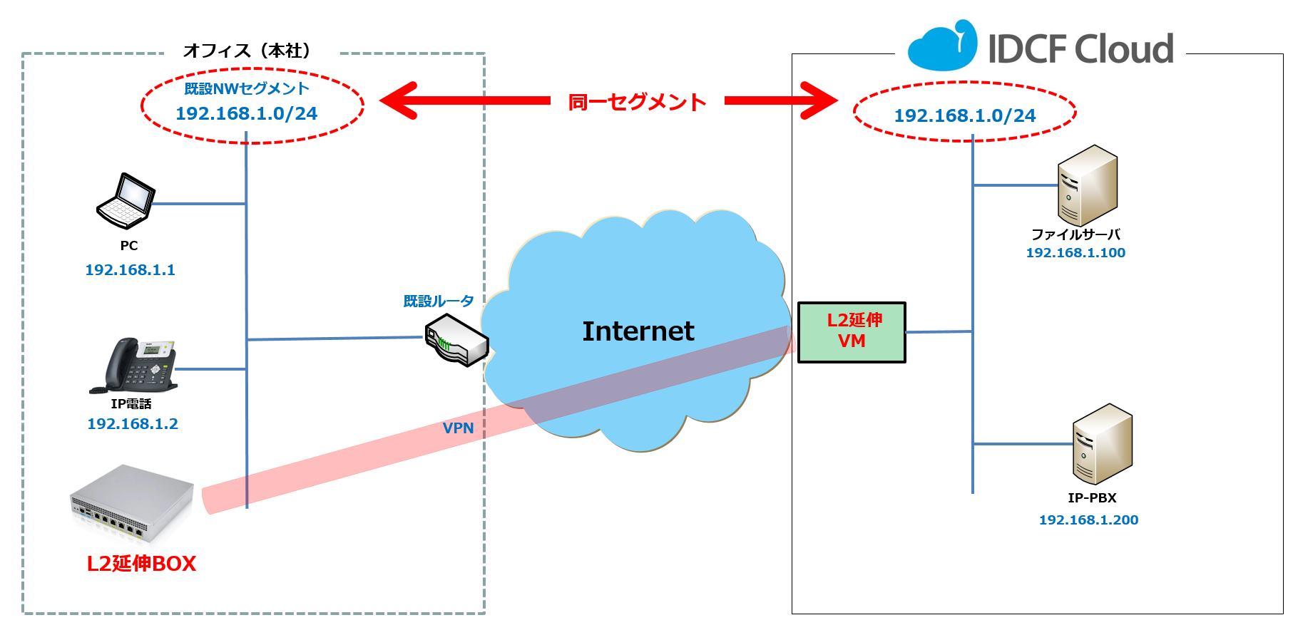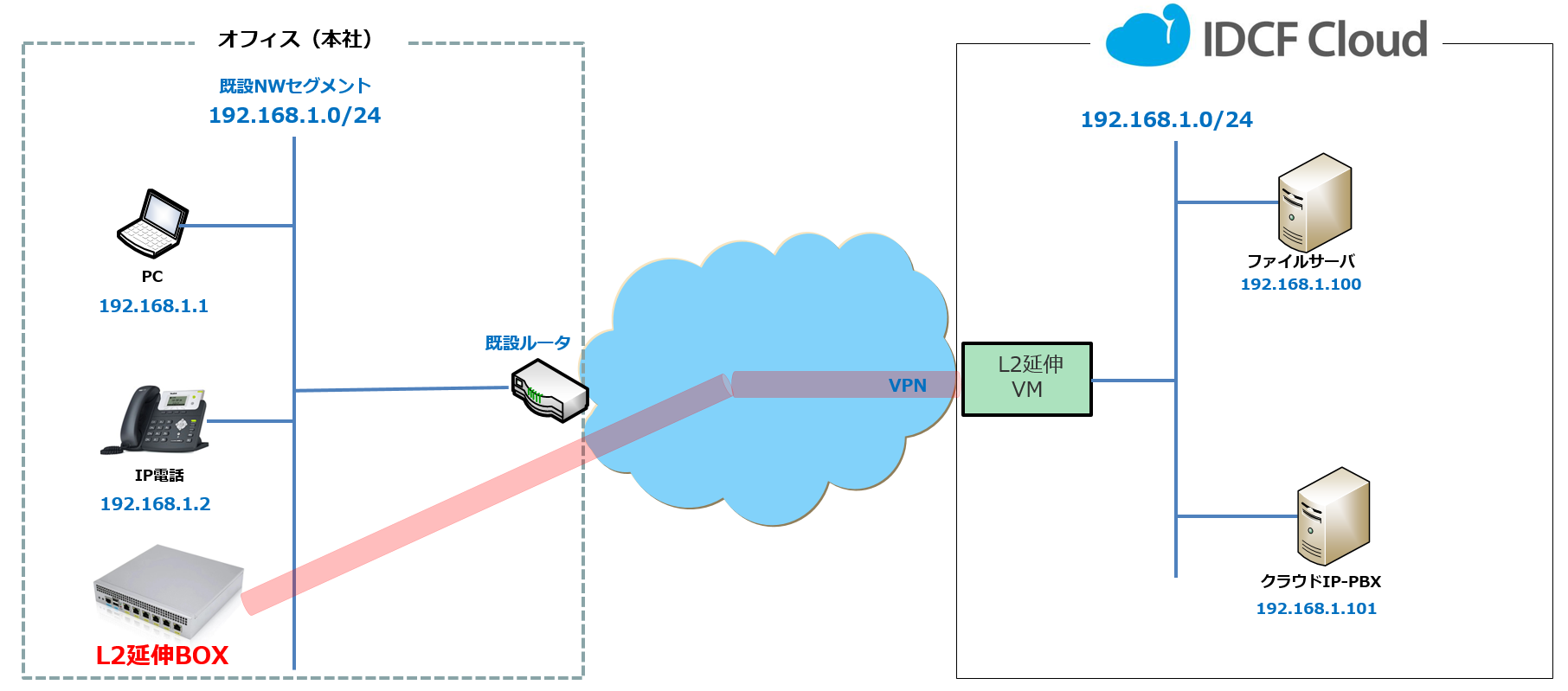 L2延伸BOXとIDCFクラウド側のL2延伸VM間でVPN+L2の延伸化を行い、オフィスネットワークと同じIPアドレス帯でIDCFクラウド側にVMを立ち上げることができます。