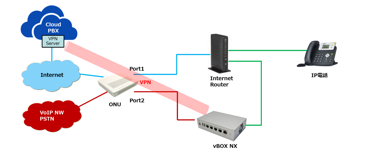 従来型のVoIPゲートウェイと一線を画すのが、クラウドPBXとの接続性で、安全に接続通信を行うためのVPNトンネル機能やPPPoE機能、ファイアウォール機能を具備しており、IPネットワークとの親和性が高い製品となっています。