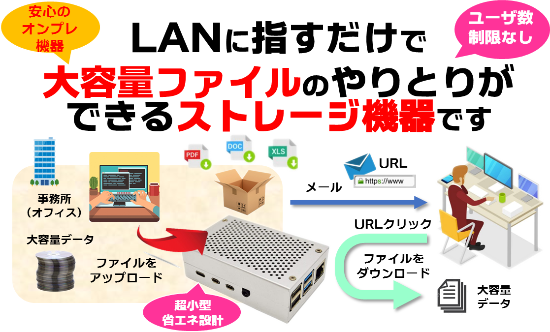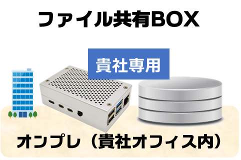 こうした課題を解決するために、当社では企業のオフィス内のLAN環境に機器を設置する仕組みで大容量ファイルをやり取りする事ができる月額費用が必要ないオンプレ型の「ファイル共有BOX」機器を開発し販売、提供をいたします。