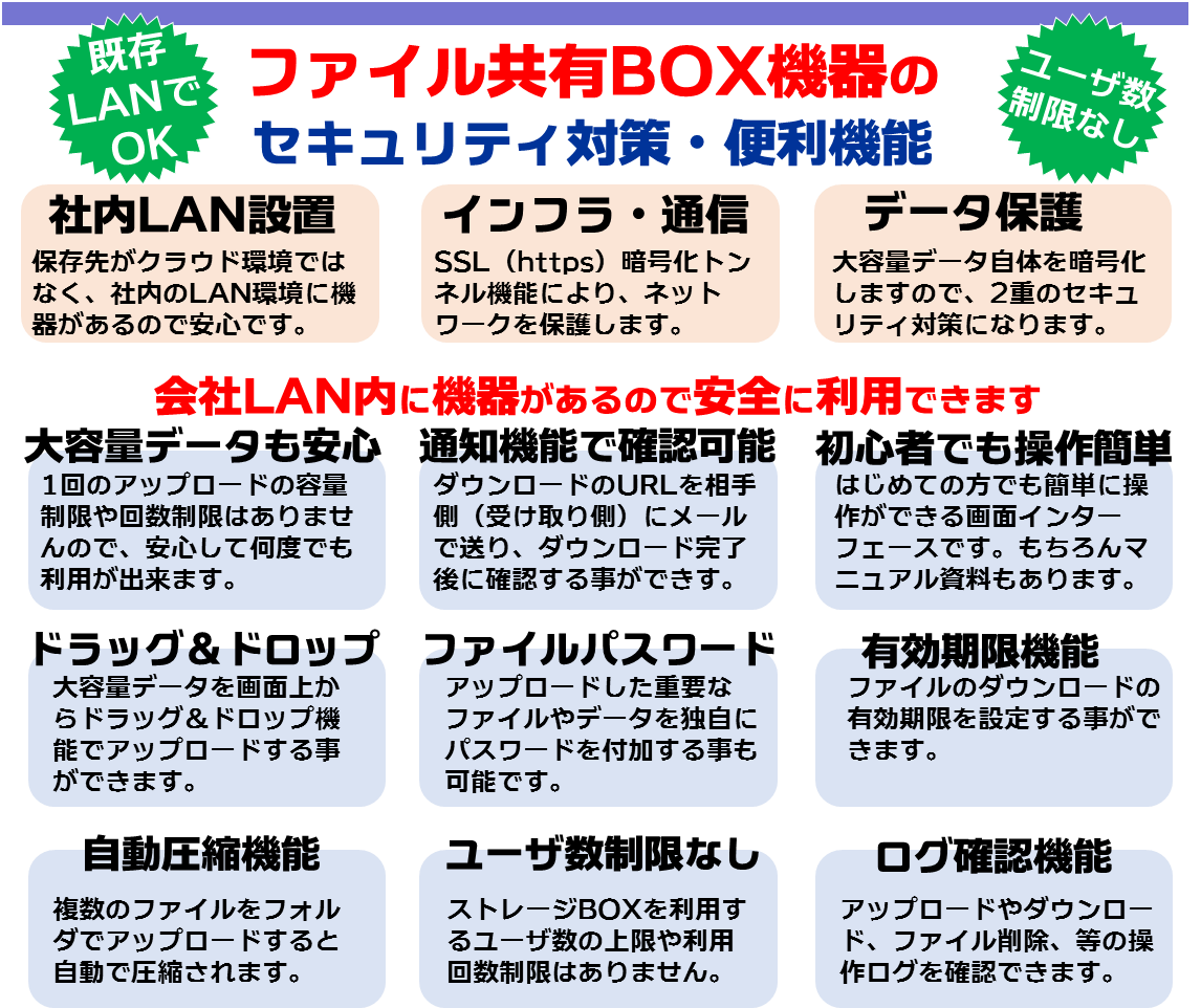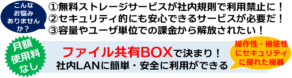 "ファイル共有BOX "はLANに設置する大容量ファイルのやりとりができるストレージ機器