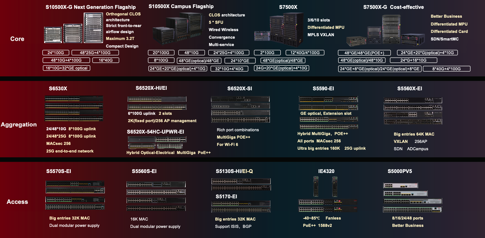 H3Cのスイッチ製品はフルラインアップがリリースされており、コア、アグリゲーション、アクセスというどの分野にも適用可能です。