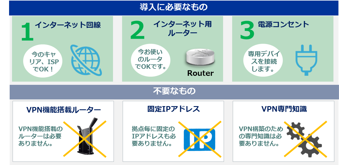 いままでの、テレワーク環境構築(VPN構築)は既存のネットワーク環境(ルータ機器、固定IPアドレス、サービスプロバイダー等)を大幅に変更する必要がありましたが、当社の「おうちワーク」ではオフィスの既存ネットワーク構成を変更すること無く、当社が提供する専用デバイス(vBOX機器)をお客様自身が社内LAN側に指すだけで、機器設置後からご利用頂くことが可能となります。